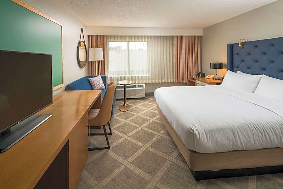 This deluxe king room features a balcony, a desk with an ergonomic chair, and a sofa bed. A 50-inch flat-screen TV, Keurig® coffee-making facilities, and a small refrigerator is provided.