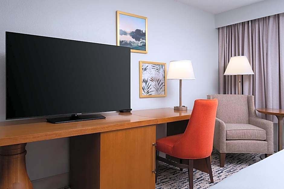 This room features a small refrigerator, Keurig® coffee-making facilities, and 50-inch flat-screen television. A desk with an ergonomic chair and clock radio are also included.