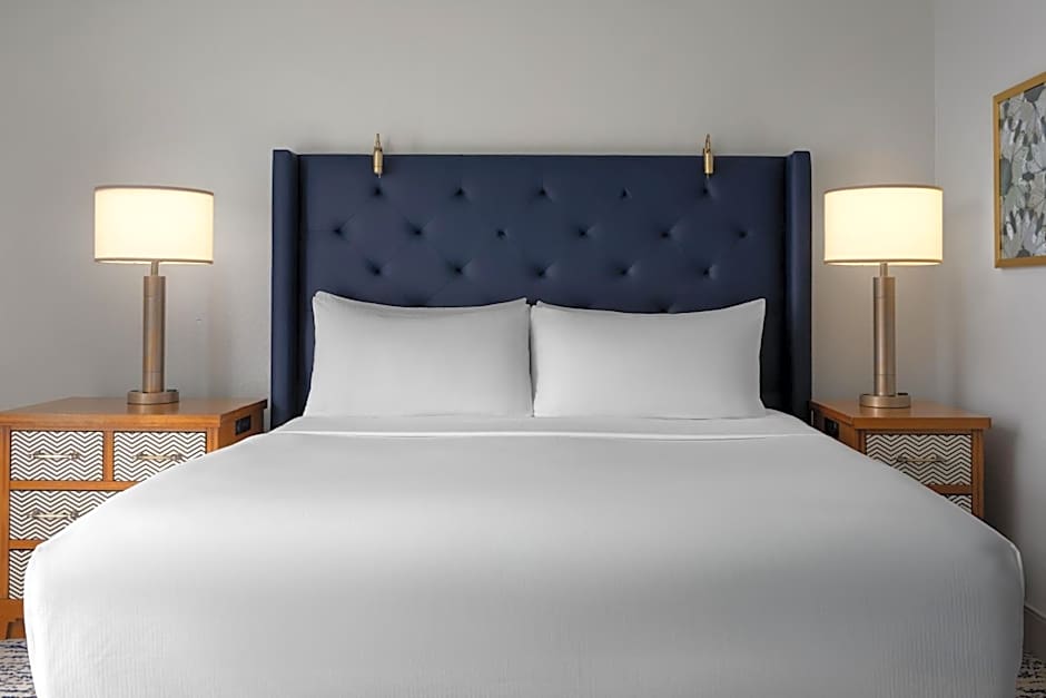 This room features a small refrigerator, seating area with chaise lounge, and 50-inch flat-screen television. A clock radio, Keurig® coffee-making facilities, and a desk with an ergonomic chair is also included.