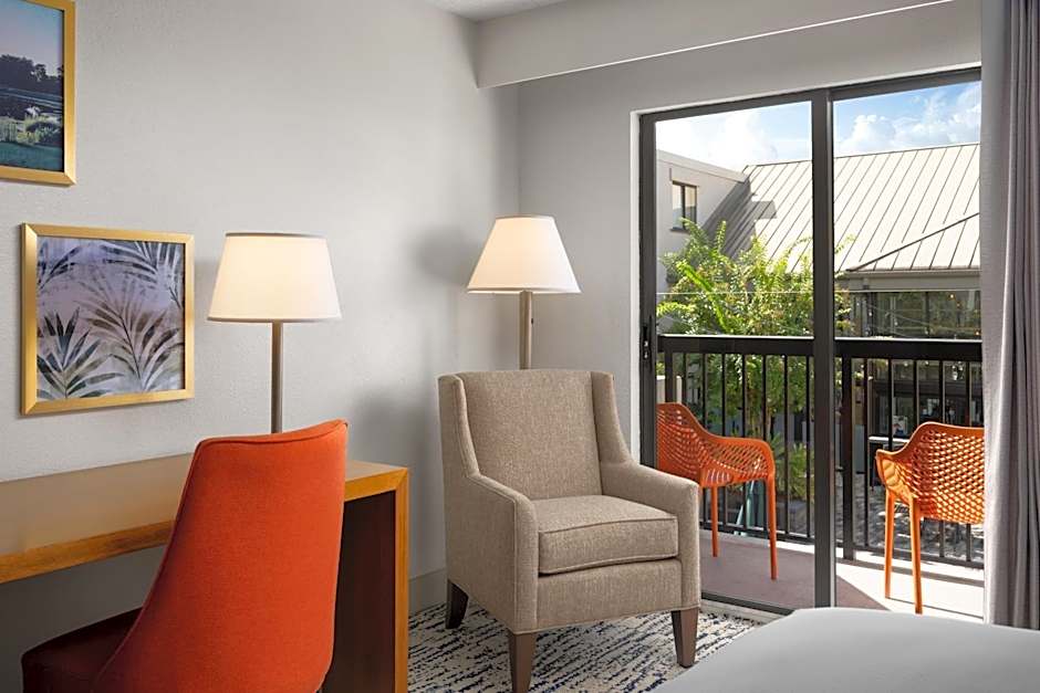 This deluxe king room features a balcony, a desk with an ergonomic chair, and a sofa bed. A 50-inch flat-screen TV, Keurig® coffee-making facilities, and a small refrigerator is provided.